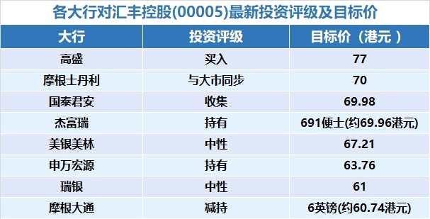大行:匯控最新評級及目標(biāo)價(jià) 高盛最高看至77港元