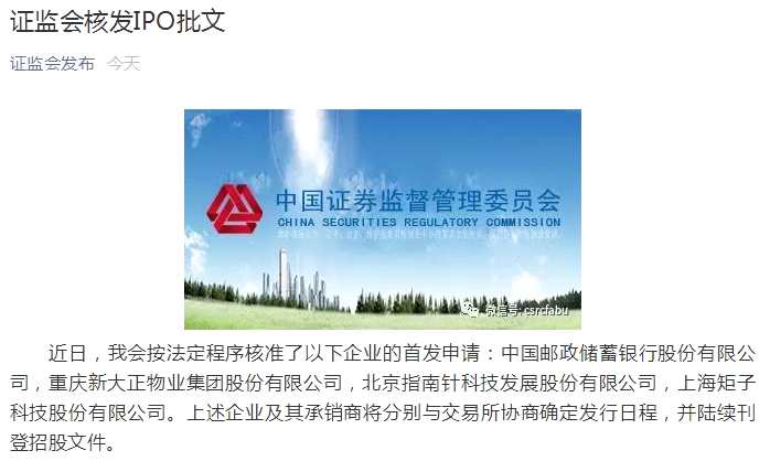 近日,我會(huì)按法定程序核準(zhǔn)了以下企業(yè)的首發(fā)申請(qǐng):中國(guó)郵政儲(chǔ)蓄銀行股份有限公司,重慶新大正物業(yè)集團(tuán)股份有限公司,北京指南針科技發(fā)展股份有限公司,上海矩子科技股份有限公司。上述企業(yè)及其承銷(xiāo)商將分別與交易所協(xié)商確定發(fā)行日程,并陸續(xù)刊登招股文件。