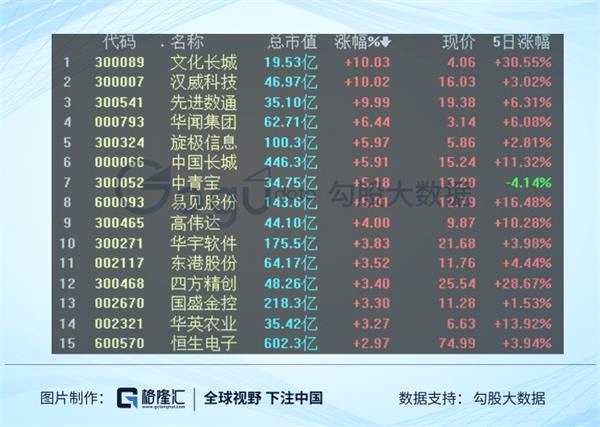 而查看整周數(shù)據(jù),一些個(gè)股更是漲幅驚人,文化長城、四方精創(chuàng)、【聚龍股份(300202)、股吧】等已經(jīng)漲超20%,另有超10只個(gè)股一周漲幅超過10%。