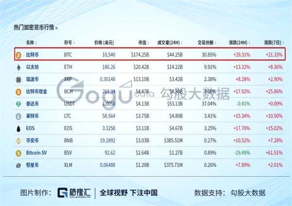 另一方面,得益于區(qū)塊鏈的利好刺激,海外數(shù)字貨幣市場亦是一通暴漲,數(shù)字貨幣的鼻祖比特幣更是一扭近期波動(dòng)大跌的趨勢,轉(zhuǎn)頭飛速突破10000美元大關(guān),24小時(shí)內(nèi)一度大漲近40%,目前報(bào)價(jià)10540美元/幣,以太坊、瑞波幣、萊特幣、EOS等也有較大幅度的上漲。