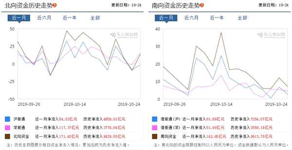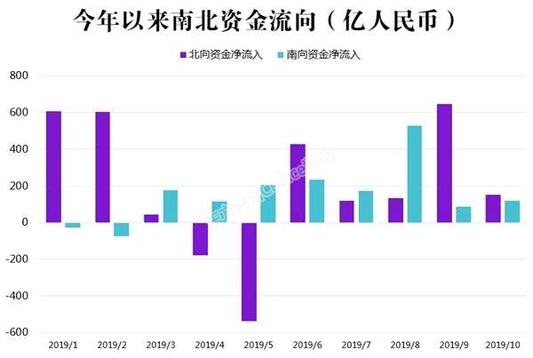 數(shù)據(jù)顯示,截至10月24日,北上陸股通資金自開通以來累計凈買入8429.55億,南下港股通資金累計凈買入9813.15億,接近1萬億。