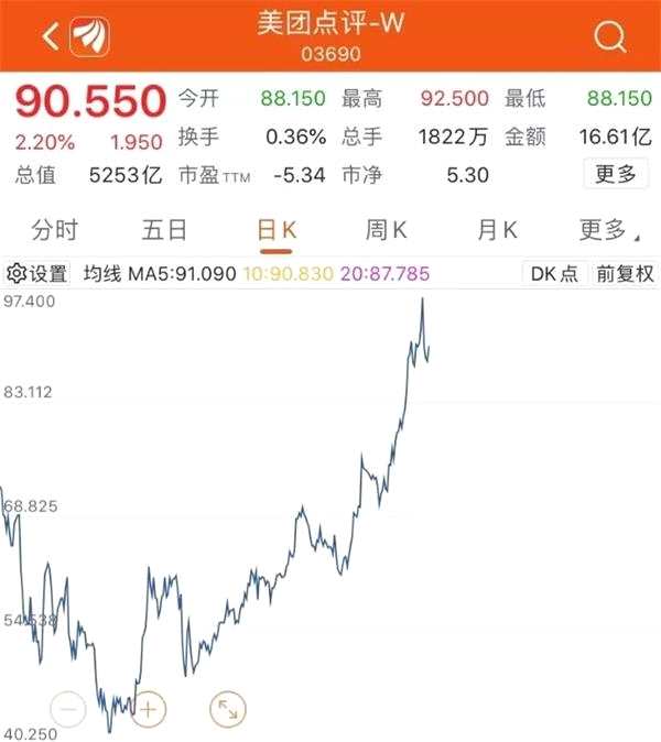 美團點評-W的股價則在今年不斷攀升,本月21日其股價更是在盤中創(chuàng)下歷史新高,達到97.4港元,目前最新收盤價為90.55港元,年內(nèi)漲幅高達106%。