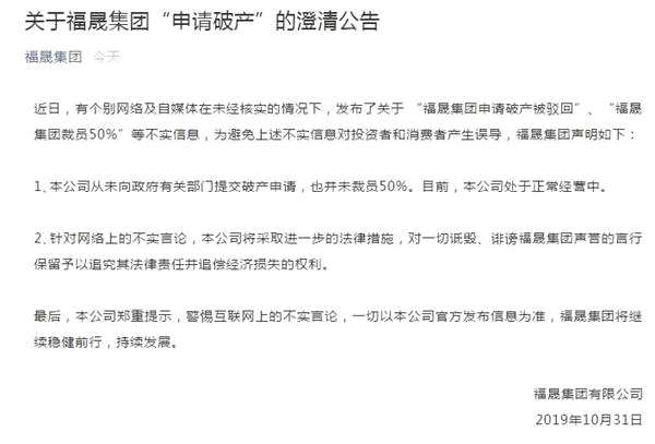 申請(qǐng)破產(chǎn)被拒?裁員50%?福晟集團(tuán)回應(yīng):不實(shí)消息