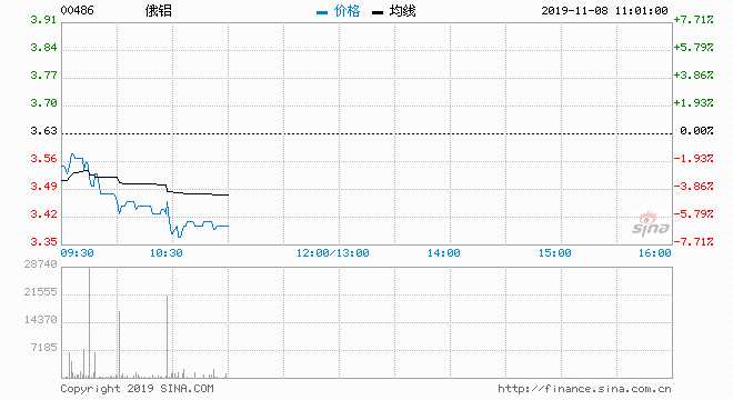 俄鋁(00486)現(xiàn)價(jià)跌4.96%,報(bào)3.45元,穿十天線(3.537元),盤中低見3.43元;成交約1231萬股,涉資4311萬元,主動(dòng)沽盤68%。