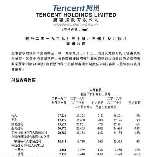 11月13日,騰訊發(fā)布了今年第三季度財報,凈利潤209.76億元,同比下降10%,非通用會計準(zhǔn)則下凈利244.12億元,同比增長24%。