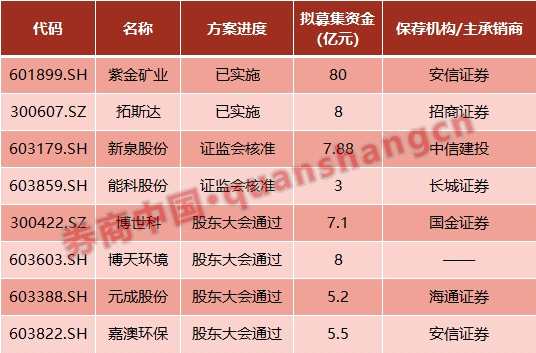 截止目前,A股市場上已有8家上市公司的公開增發(fā)正在推進當中。其中,除紫金礦業(yè)、拓斯達已進行到發(fā)行階段外,【新泉股份(603179)、股吧】和能科股份的方案已獲證監(jiān)會核準,另有4家公司方案已獲股東大會通過。