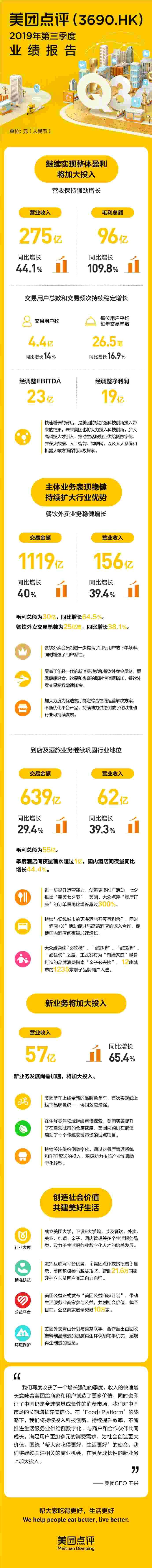 摘要: 11月21日消息,美團(tuán)點(diǎn)評公布第三季度業(yè)績,美團(tuán)Q3實(shí)現(xiàn)營收274.94億元,同比增長44.1%;實(shí)現(xiàn)凈利13.33億,再度實(shí)現(xiàn)盈利。營收、凈利遠(yuǎn)超市場預(yù)期。2019年第三季度美團(tuán)總收入由2018年同