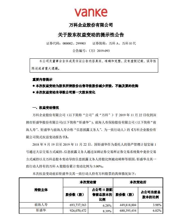 萬(wàn)科企業(yè)22日晚間公告,2018年9月19日至11月22日,因鉅盛華作為委托人的資產(chǎn)管理計(jì)劃寶祿1號(hào)通過(guò)大宗交易、集中競(jìng)價(jià)方式減持以及萬(wàn)科總股本變動(dòng),導(dǎo)致鉅盛華與前海人壽持股比例被動(dòng)稀釋等原因,鉅盛華及其一致行動(dòng)人前海人壽持有的萬(wàn)科A股股份累計(jì)變動(dòng)比例為5%。