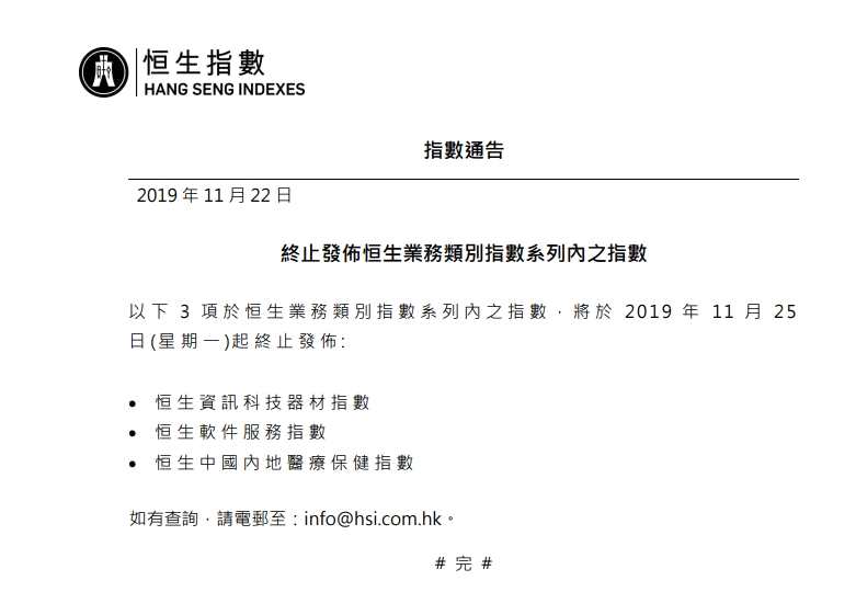摘要: 11月22日消息,恒指公司發(fā)布公告稱,恒生資訊科技器材指數(shù),恒生軟件服務(wù)指數(shù),恒生中國(guó)內(nèi)地醫(yī)療保健指數(shù)將于下周一(11月25日)起停止發(fā)布。以下為恒指公司原文:
