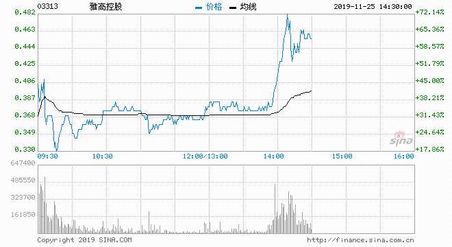 11月25日消息,雅高控股反彈一度暴漲80%?,F(xiàn)漲60.71%,報0.45港元,最新市值達(dá)14億港元。上周四雅高控股暴跌98%,周五再跌8%。