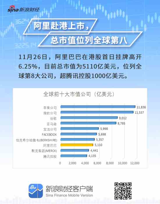 11月26日消息,阿里巴巴正式登陸港股上市,阿里巴巴隔夜美股漲1.99%,最終報價190.44美元,折合港股為186.3146港元,相對于港股招股價漲5.86%。今日阿里巴巴掛牌在港股高開6.25%,報價187港元,總市值為39993億港元,市值超過騰訊的32573億港元。目前,目前總市值為5110億美元,位列全球第8大公司,超騰訊控股1000億美元。