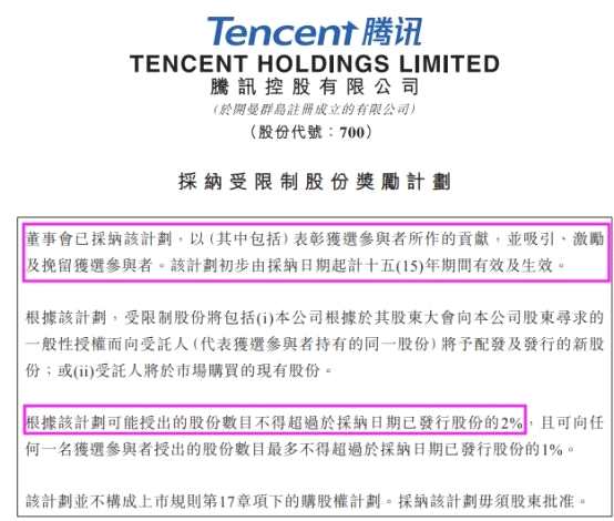 根據(jù)過往公告,騰訊曾在2007年和2013年分別提出過為期10年和15年的員工股權激勵計劃,獎勵股份總數(shù)上限分別為當時已發(fā)行股份的2%和3%。