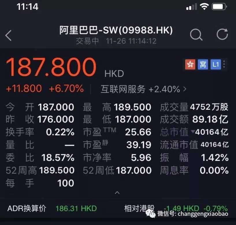 今日早間,阿里巴巴(9988.HK)正式登陸香港聯(lián)合交易所。首日開盤價(jià)187港元,目前最新股價(jià)為187.8港元,漲幅達(dá)到6.93%,以此計(jì)算,阿里的市值為4萬億港元,一舉超越騰成為香港市場(chǎng)市值排名第一的公司。