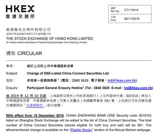 港交所:浙商銀行將于12月10日加入中華通證券名單