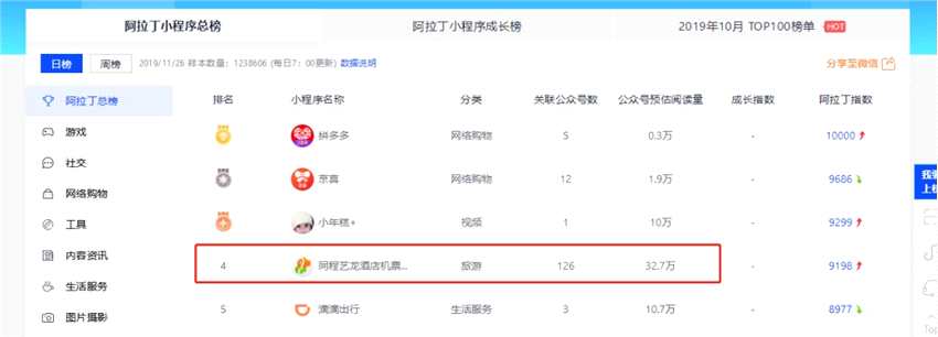 得益于用戶使用微信小程序預(yù)訂出行產(chǎn)品習(xí)慣的養(yǎng)成,加上同程藝龍對流量的敏感把握和精準(zhǔn)挖掘,據(jù)阿拉丁數(shù)據(jù)顯示,同程藝龍小程序已經(jīng)在2018年9月至12月實(shí)現(xiàn)總榜單“四連冠”,并長期占據(jù)旅游行業(yè)榜單第一。