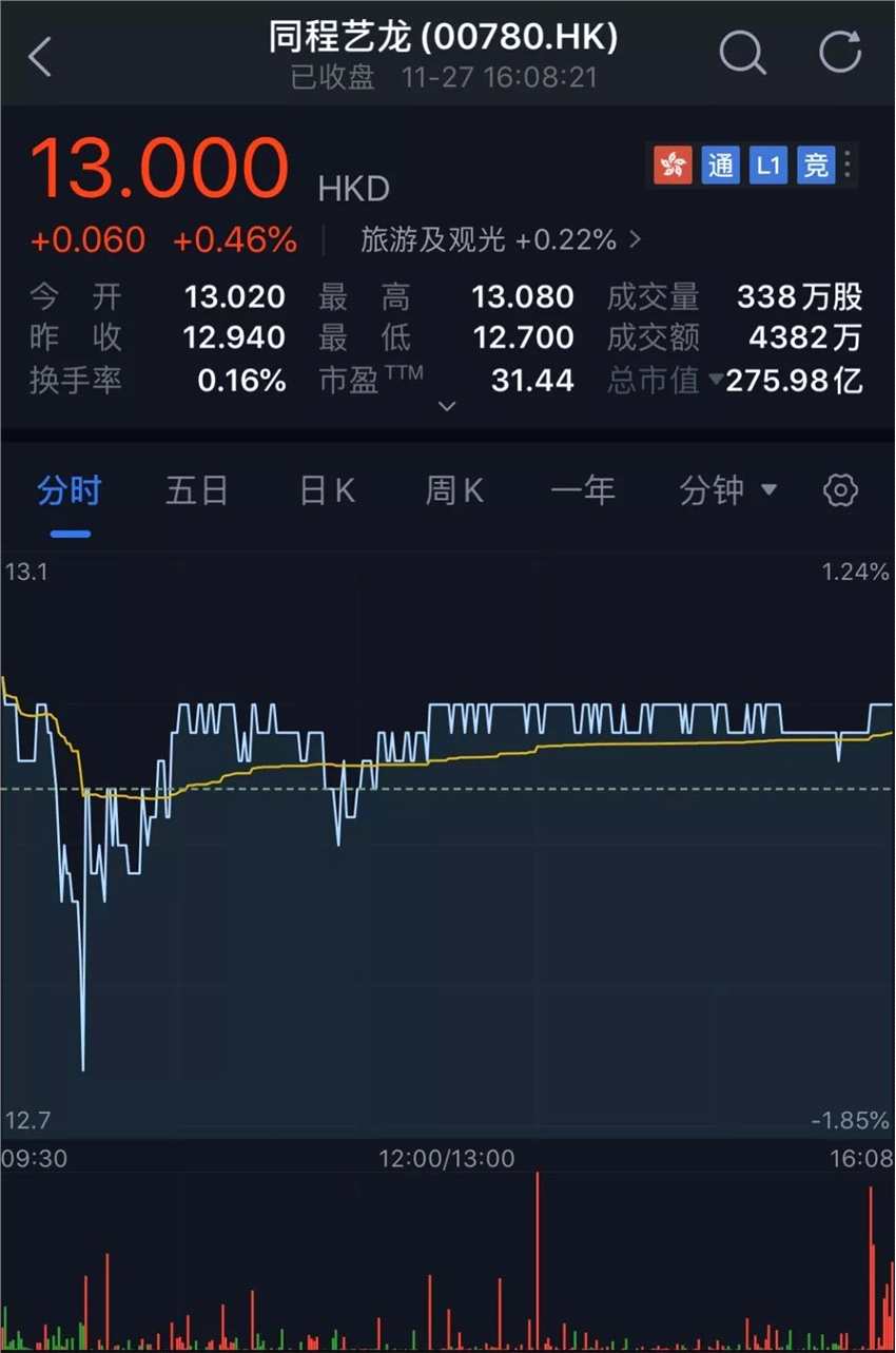 截至今天(11月27日)港股收盤,同程藝龍報(bào)收13港元,市值275.98億港元。