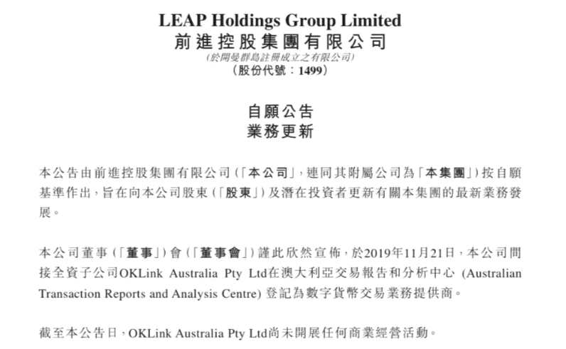 近日,前進(jìn)控股曾公告,間接全資子公司OKLink Australia Pty Ltd在澳登記為數(shù)字貨幣交易業(yè)務(wù)提供商。數(shù)字貨幣相關(guān)業(yè)務(wù)或逐漸注入上市公司。