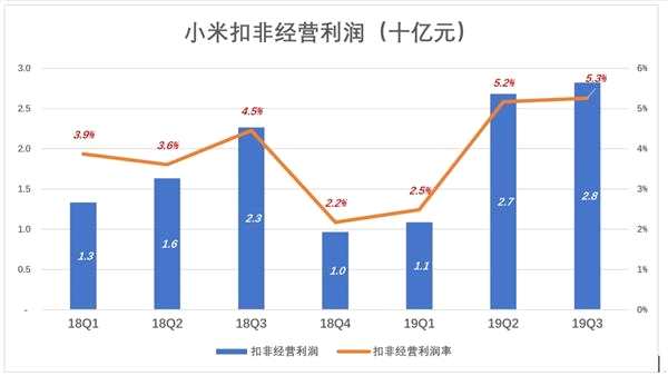 2019年Q2、Q3,小米扣非經(jīng)營(yíng)利潤(rùn)分別為27億和28億,利潤(rùn)率分別為5.2%和5.3%。