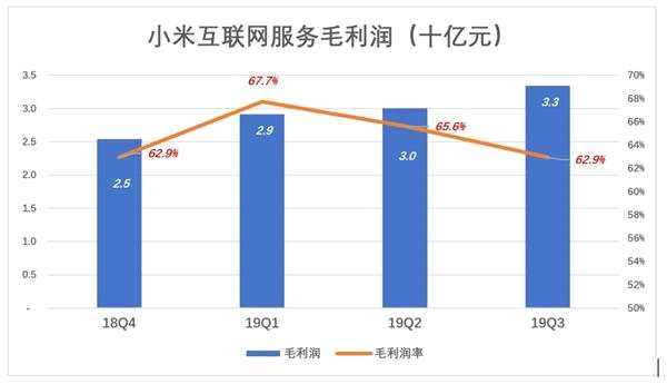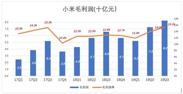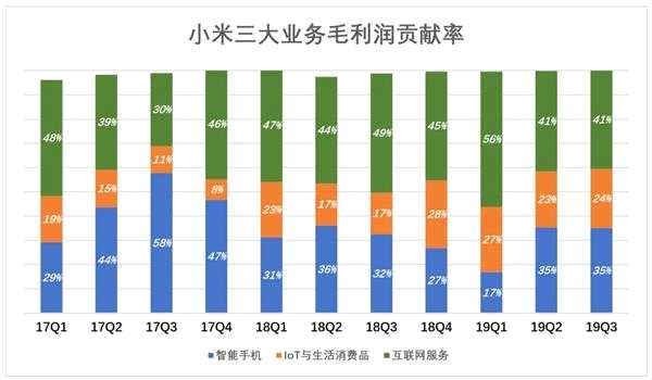 2017年Q3,小米整體毛利潤(rùn)率高達(dá)15.3%,手機(jī)業(yè)務(wù)對(duì)毛利潤(rùn)的貢獻(xiàn)率為58%;2019年Q3,毛利潤(rùn)率回到15.3%,不同的是互聯(lián)網(wǎng)服務(wù)對(duì)毛利潤(rùn)的貢獻(xiàn)率為41%(2017年同期為30%)。