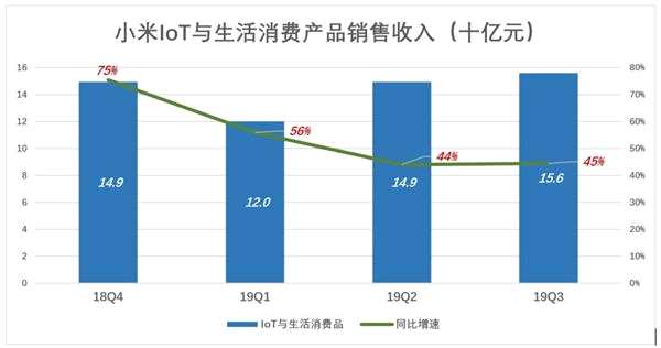 2019年1月11日,小米宣布“手機(jī)+AIoT”雙引擎戰(zhàn)略。2019年Q3,IoT生活消費(fèi)產(chǎn)品銷售收入156億,同比增長(zhǎng)45%。