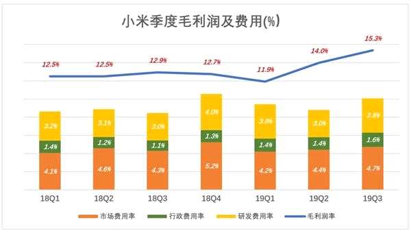 從百分比視圖看,2019年Q3小米毛利潤(rùn)率15.3%,三項(xiàng)費(fèi)用合計(jì)10%。在所有互聯(lián)網(wǎng)公司中,綜合費(fèi)用率能夠控制在10%一線的非常少。