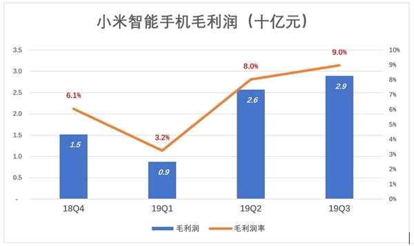 小米手機(jī)薄利多銷策略沒(méi)有根本改變,但毛利潤(rùn)率悄然提高。2019年Q1,小米智能手機(jī)業(yè)務(wù)毛利潤(rùn)只有3.2%。Q2、Q3分別為26億和29億,毛利潤(rùn)率分別為8%、9%。