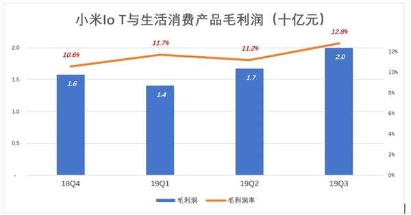 IoT與生活消費(fèi)產(chǎn)品毛利潤(rùn)率一直在10%以上,2019年Q3略微升至12.8%,毛利潤(rùn)達(dá)到20億。這個(gè)領(lǐng)域競(jìng)爭(zhēng)也很激勵(lì),但程度不及智能手機(jī)領(lǐng)域,小米得以多賺幾個(gè)點(diǎn)的毛利潤(rùn)。
