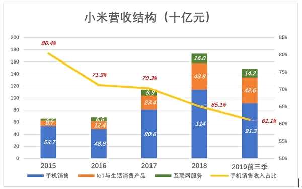2019年前三季,小米三大主營(yíng)業(yè)務(wù)收入分別為:手機(jī)913億、IoT與生活消費(fèi)產(chǎn)品426億、互聯(lián)網(wǎng)服務(wù)142億。其中手機(jī)銷售收入占營(yíng)收的比值從2015年的80.4%降至2019年前三季的61.1%。