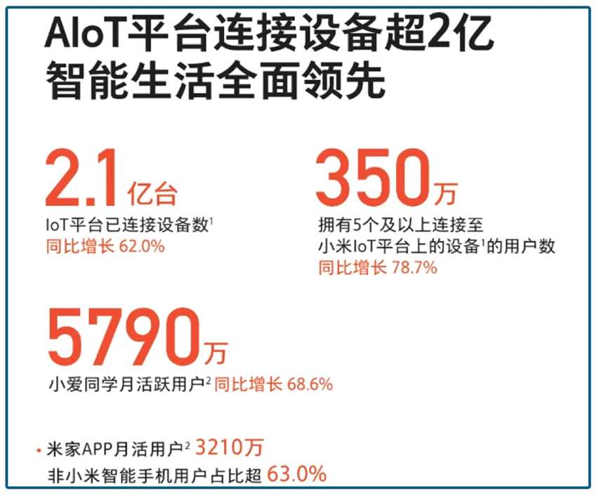 小米的三季報(bào)數(shù)據(jù)顯示,截止3季度,小愛同學(xué)的月活用戶量已經(jīng)達(dá)到5790萬,而IoT平臺已連接的設(shè)備數(shù)(不含手機(jī)和筆記本)已經(jīng)達(dá)到了2.13億,同比增長62%,而擁有5個及以上設(shè)備數(shù)的用戶已經(jīng)增至350萬,同比增長了78.7%。