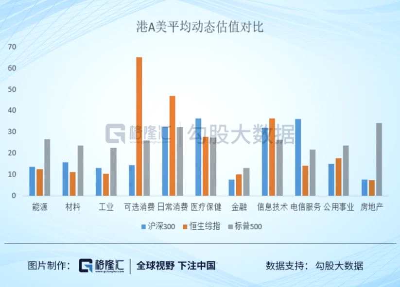 所以,要看港股到底有多便宜,我們就要伸到數(shù)據(jù)的底層,這里我們先伸到第一層,來拆一下,分行業(yè)來對比,看看港股有多便宜。數(shù)據(jù)處理關(guān)系,這里就只選港股恒生綜指、A股滬深300以及全球標桿標普500。