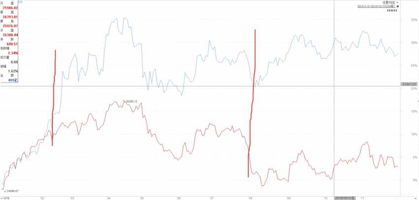 第一階段:第一段豎線前的位置,上半年,由于悲觀情緒的扭轉,港股與A股同樣開啟了反彈,隨后與A股指數同調上漲。