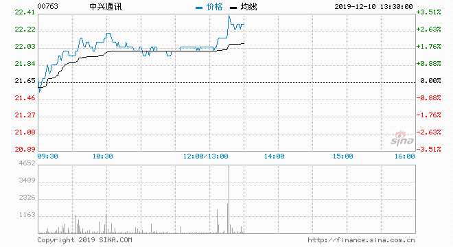 12月10日消息,中興通訊小幅拉升,截至發(fā)稿,中興通訊漲3%,報22.35港元。