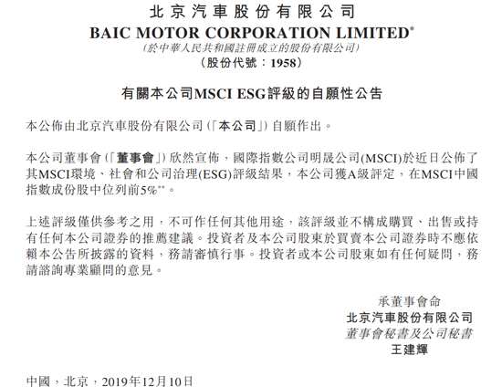 北京汽車:在MSCI ESG評級中獲A級評定