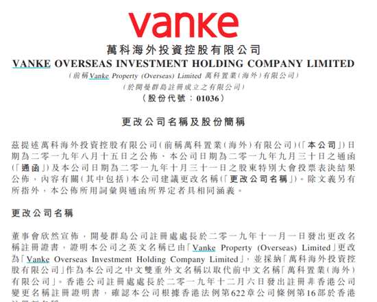 摘要: 12月11日消息,萬科置業(yè)海外(01036.HK)發(fā)布公告,開曼群島公司注冊處處長于2019年11月1日發(fā)出更改名稱注冊證書,證明公司的英文名稱已由“VankeProperty(Overseas)Li