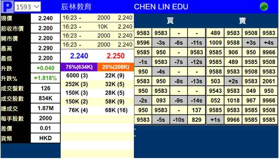 12月12日消息,明日四新股掛牌交易,各股暗盤漲跌不一。辰林教育漲1.82%,報(bào)價(jià)2.24港元。