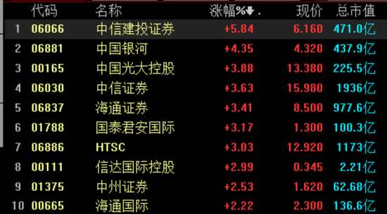 12月13日消息,中資券商股拉升,截至發(fā)稿,中信建投證券漲5.84%,中國銀河(601881,股吧)漲4.35%,中信證券(600030,股吧)、海通證券(600837,股吧)等漲超3%。