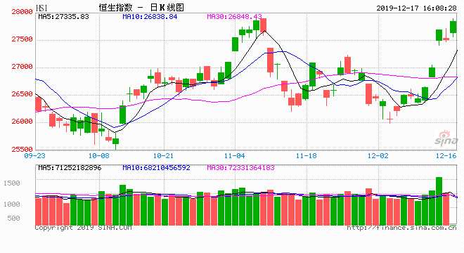 12月17日消息,周一(12月16日)美股三大指數(shù)繼續(xù)上揚,齊創(chuàng)收市新高。今日早盤,港股恒指高開高走。截至收盤,恒指大漲1.22%,報27843.71點;國企指數(shù)漲1.73%,報10964.99點;紅籌指數(shù)漲0.72%。大市成交1053.48億元??萍脊?、醫(yī)藥股、金融股集體發(fā)力。