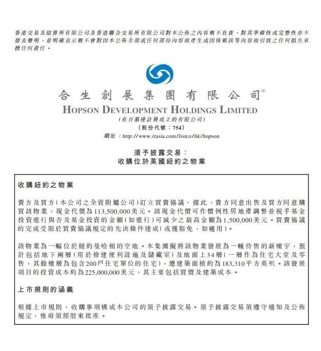 近日,合生創(chuàng)展集團(tuán)有限公司(下稱“合生創(chuàng)展”,0754.HK)發(fā)布公告,宣布以1.14億美元收購(gòu)一宗位于美國(guó)紐約曼哈頓的空地。據(jù)悉,這是合生創(chuàng)展在中國(guó)境外的首個(gè)投資項(xiàng)目。