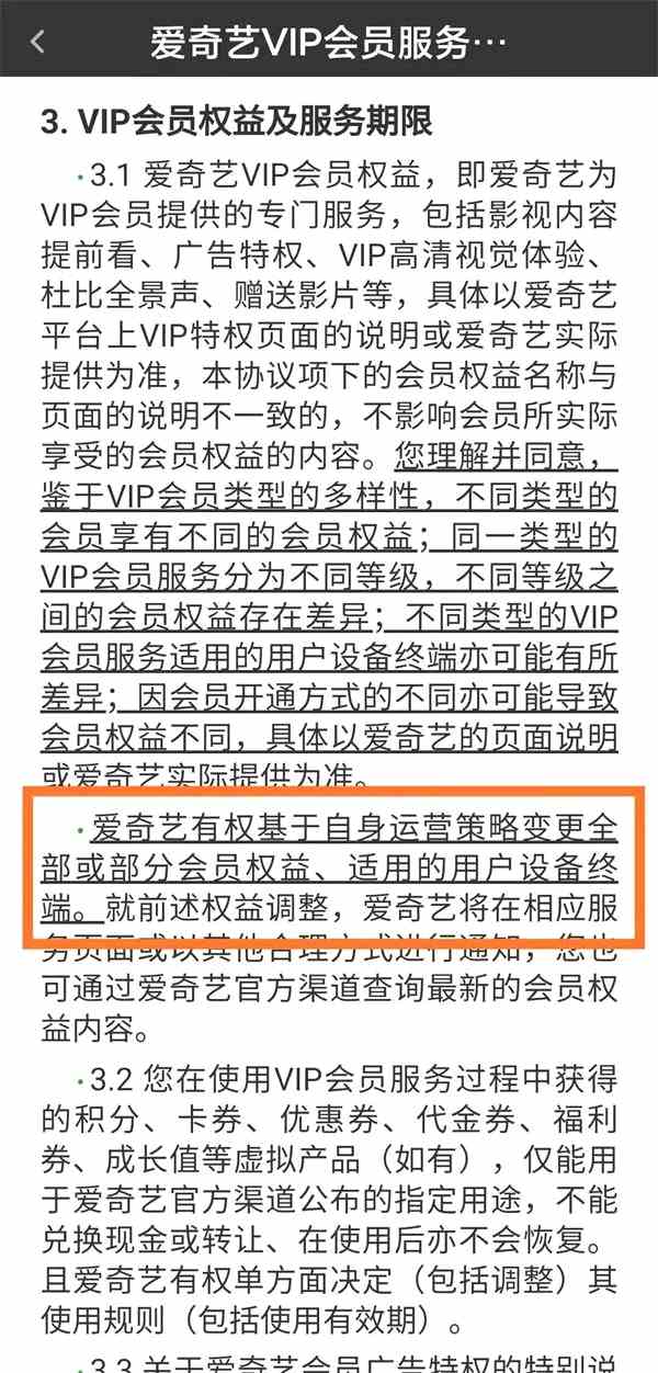 值得一提的是,已有消費(fèi)者對愛奇藝提起了訴訟。據(jù)《國際金融報(bào)》記者了解,提起訴訟的消費(fèi)者是愛奇藝的忠實(shí)用戶,其恰好是一名律師。該律師在翻看了愛奇藝的《愛奇藝VIP會員服務(wù)協(xié)議》(下稱《協(xié)議》)后,發(fā)現(xiàn)《協(xié)議》內(nèi)多處存在違反《合同法》40條規(guī)定的格式條款,比如第3.1第二款約定的“愛奇藝有權(quán)基于自身運(yùn)營策略變更全部或部分會員權(quán)益、適用的用戶設(shè)備終端”很明顯違反了公平原則,嚴(yán)重侵害了廣大消費(fèi)者的合法權(quán)益,應(yīng)屬無效。