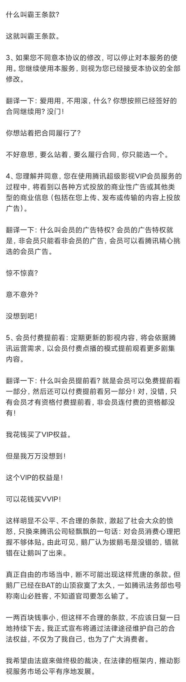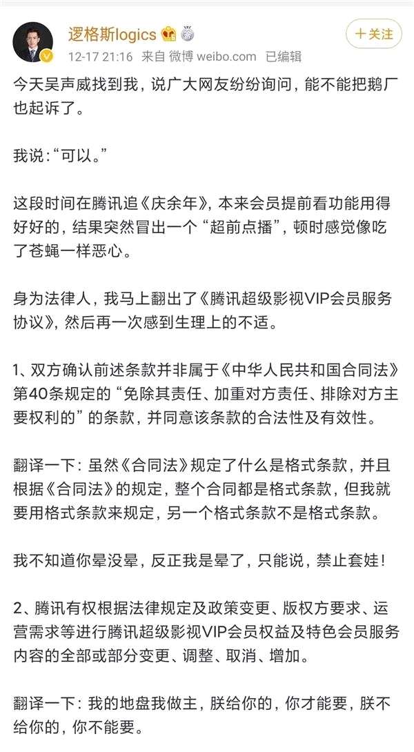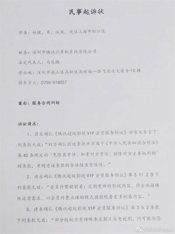 無獨(dú)有偶,12月18日,微博博主@邏格斯logics 發(fā)文,稱已經(jīng)起訴騰要求確認(rèn)騰訊視頻超級影視VIP會員服務(wù)協(xié)議下的多條條款,并賠償經(jīng)濟(jì)損失500元。