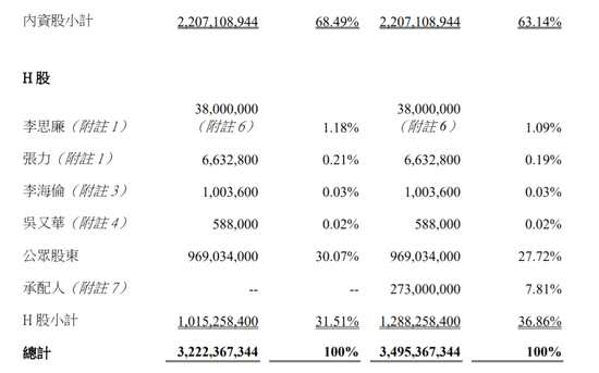 配售完成后,李思廉內(nèi)資股持股將從32.43%稀釋為29.9%。李思廉H股持股占比將從1.18%稀釋為1.09%。