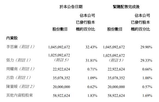 配售完成后,李思廉內(nèi)資股持股將從32.43%稀釋為29.9%。李思廉H股持股占比將從1.18%稀釋為1.09%。