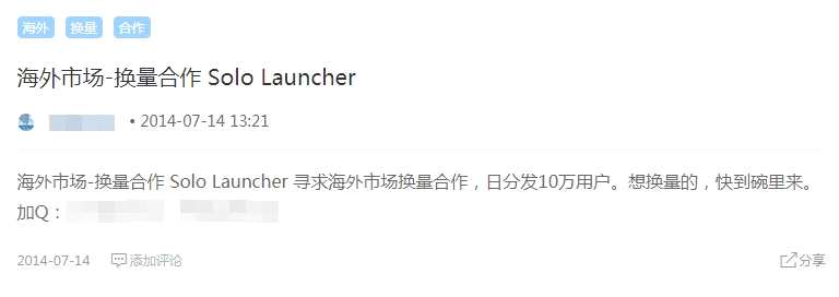 通過(guò)搜索我們發(fā)現(xiàn),赤子城也曾熱衷于換量推廣的玩法,下圖中的Solo Launcher正是當(dāng)時(shí)赤子城的核心產(chǎn)品。
