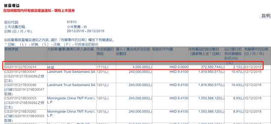 林斌所持部分小米股票存托機(jī)構(gòu)變更 持股比例不變