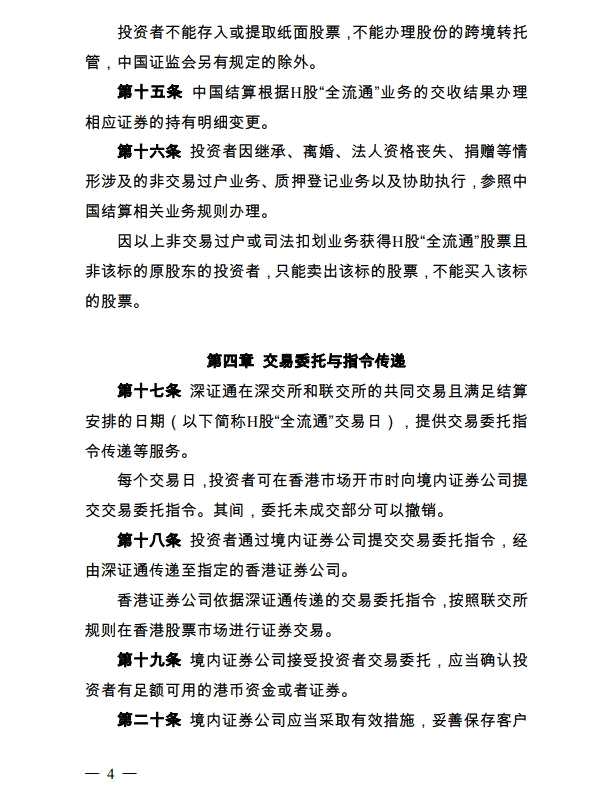 為落實全面推開H股“全流通”改革,規(guī)范H股“全流通”的登記存管和交易結(jié)算業(yè)務(wù),中國證券登記結(jié)算有限責任公司和深圳證券交易所聯(lián)合制定了《H股“全流通”業(yè)務(wù)實施細則》(以下簡稱《細則》)?,F(xiàn)經(jīng)中國證監(jiān)會批準,予以發(fā)布,并自發(fā)布之日起施行。