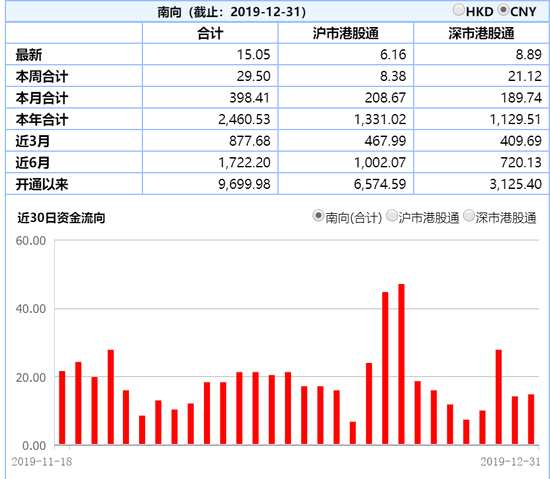 2020年1月2日消息,今年以來(lái),北向資金共計(jì)流入3517.43億,創(chuàng)歷史新高。開通以來(lái),累計(jì)流入9934.77億元。南向資金流入2460.53億元,12月流入398億,開通以來(lái)流入額高達(dá)9699.98億,比北向資金少234.79億。其中,滬市港股通流入6574.59億,深市港股通流入3125.4億港元。(新浪港股年終盤點(diǎn)第八篇——內(nèi)資持有港股情況)