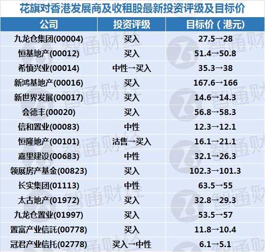 花旗發(fā)布報(bào)告,對(duì)香港發(fā)展商及收租股最新投資評(píng)級(jí)及目標(biāo)價(jià)如下表: