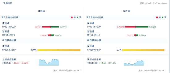 2020年1月6日消息,截至滬深股市午間收盤,滬指跌0.57%,北向資金凈流入5.35億,滬股通流出4.49億,滬深港通資金流如下: