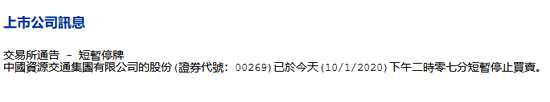 中國資源交通10日下午盤中短暫停牌 原因待公布