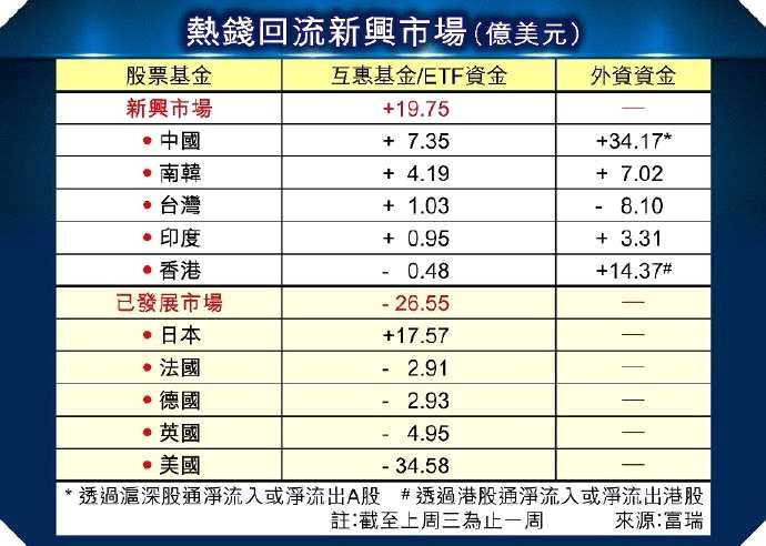 事實上,資金有回流新興市場跡象。富瑞報告指出,截至上周三止一周,新興市場股票基金錄19.75億美元凈流入,連續(xù)11周錄“新錢”,累積金額248.51億美元(約1,938.37億港元)。中國股票基金單周錄7.35億美元來自互惠基金及交易所買賣基金(ETF)資金凈流入,連續(xù)9周共凈流入87.18億美元。相反,其他歐美股票基金期內(nèi)均錄凈流出。